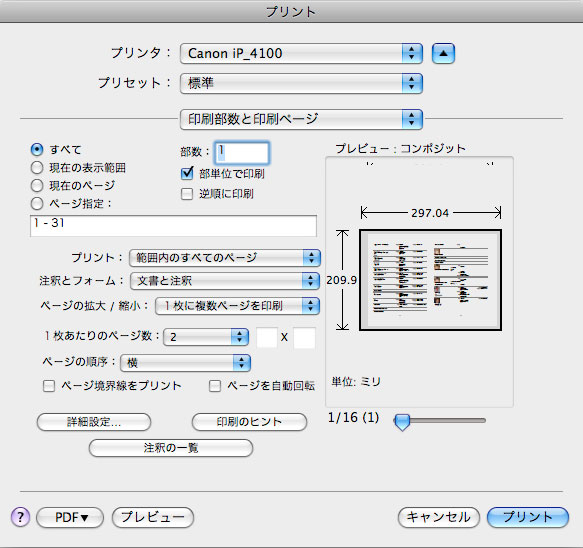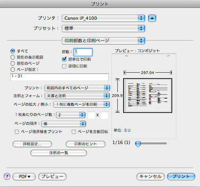 最後に印刷する時に最初、pdfとして保存してから1枚あたりのページ数を”2″にして紙にプリントしてやると真ん中から半分に折ってホチキスで留められる。