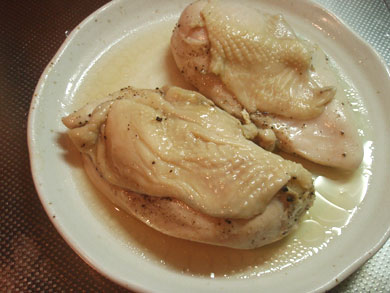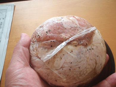 土曜日から始めて昨晩レンジでチンして4日目の今日やっと食べられました。見て、この断面。見慣れた鳥肉とは別物。まさにハム。