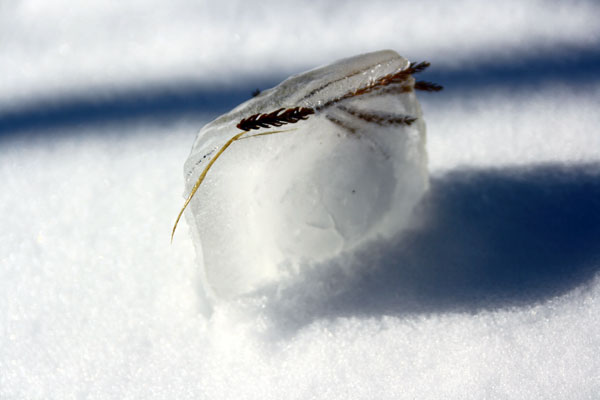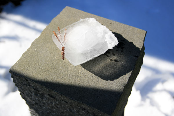 石彫りの仕事場の朝。寒くて厚い氷+春の様な明るい光。雪と氷の写真を撮るのに最高な日。(いつものようにクリックで拡大)