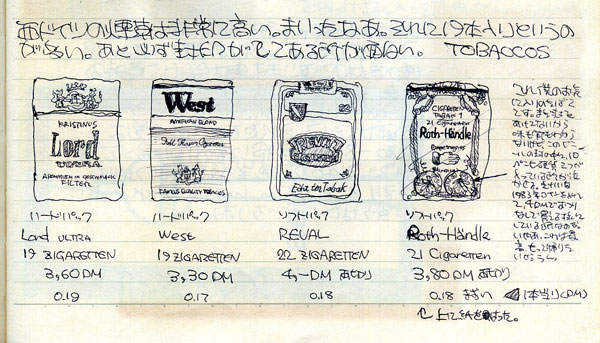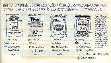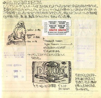 トイレットペーパーから切符、お菓子の包み紙まで何でも貼り付けてボールペンでスケッチしたり使った金額をメモしたり日記を書いたりした旅のノートにもDRUMの絵を描いてた。(クリックで拡大)