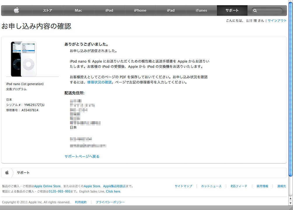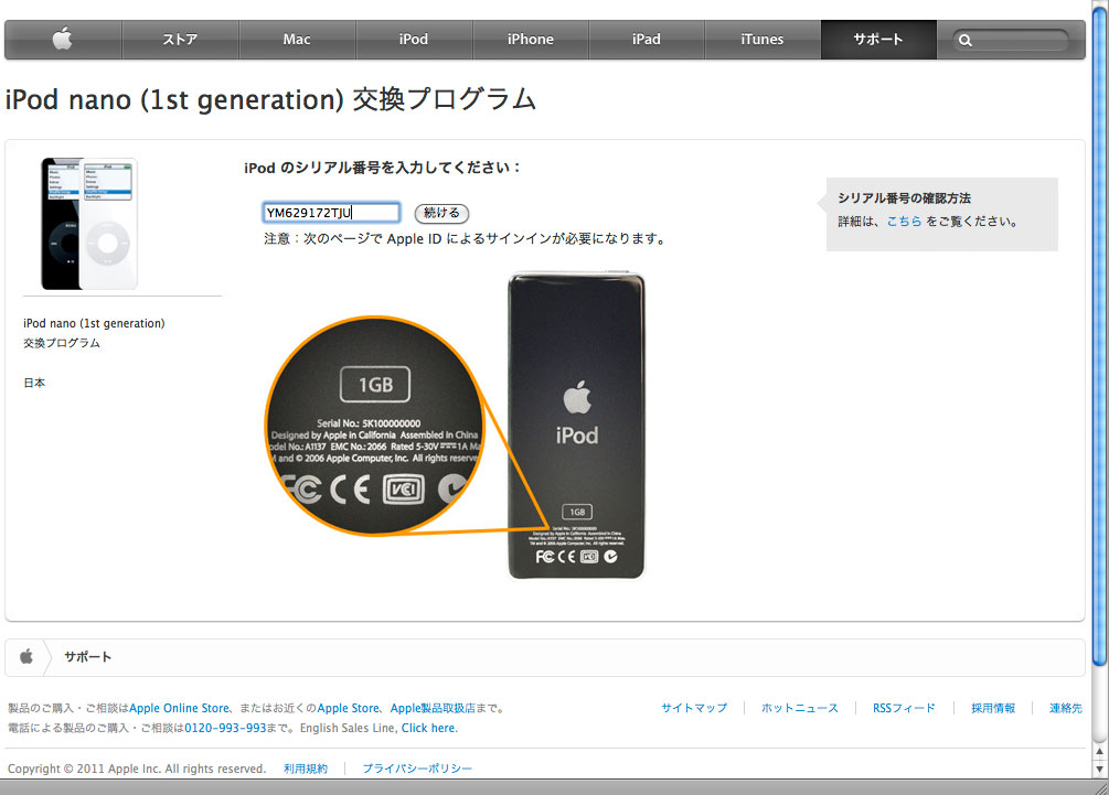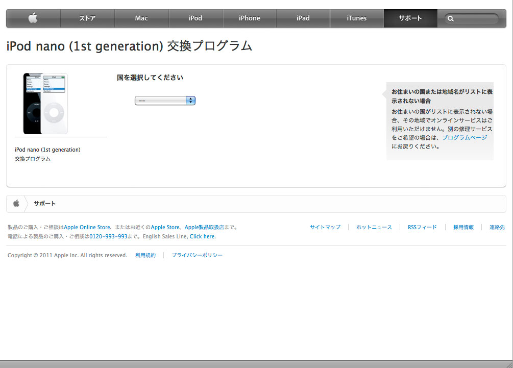 iPod nano (1st generation)の交換プログラムに該当したようだ。6年も前に買ったものだけど。Appleによると、ごく稀にバッテリーが加熱して安全上の問題を引き起こす可能性があることを確認しております、という事だ。