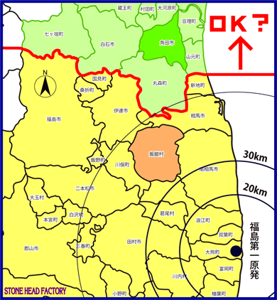 先日、文科省の原子力損害賠償紛争審査会は図の赤線から下の地域の人たちには賠償金を支払うとする指針をまとめた。赤線から下の地域で暮らしていた人には原発事故による精神的苦痛があった事を認めたのだ。そして赤線から上の人については全く言及が無かった。原発の影響も精神的苦痛も無かったとでも言うように。これは国によるブラック・ジョークとしか思えない。全然笑えない。