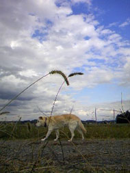 昼食に家に戻って愛犬小春と田んぼの畦道をいつものように散歩。一方の空は明るく青く、だけどその反対側は真っ黒になってきたな、と思っていたら。