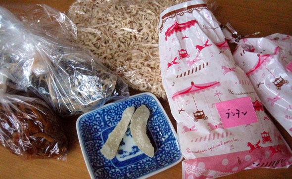 漬け物、切り干し大根、ブンタンとハッサクの皮の砂糖菓子。全部手作りのもの。ていねいな仕事。嬉しいなぁ。