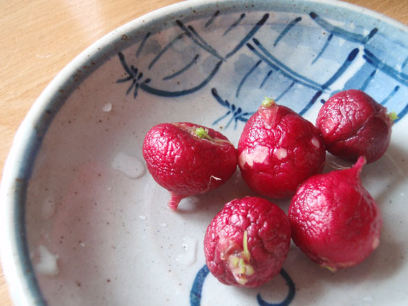 ラディッシュの玄米麹漬け。1月のグループ展の折、お世話になっている方にいただいた玄米麹に浸けてみたら絶品。ラディッシュの独特なさわやかな香気、ガリリと噛んで現れる内側の赤色もきれい。