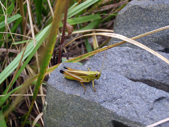 鳴くといえば、先日バッタがシャドーボクシングのように後ろ足で音を鳴らす事を初めて知った。仕事場で機械を止めて一息入れている時に、その音を知った今では驚くほどたくさんのバッタがあちこちの草むらでやっているのに気が付いた。本当にあちこちでみんなやってるんだよ。しかも音が結構大きい。音を頼りに近づいて見ることは出来るのだけどムービーが撮れない。前回の音無しではなくてなんとかみんなに音入りを見せてあげたくて時々挑戦していたのだけど、ただでさえ警戒心が強くて近づくことすら難しいのに、写るくらいまでカメラを持って近づくのは至難の業。しかも近づいたら警戒してもう二度と足鳴らしはやってくれない。