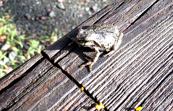 ずっと木の上にいたから同じ色になってるよ、カエルくん。