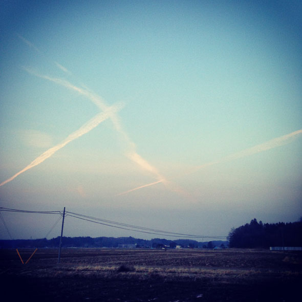 夕暮れ。空にいくつも大きな飛行機雲。明日は雨かな?