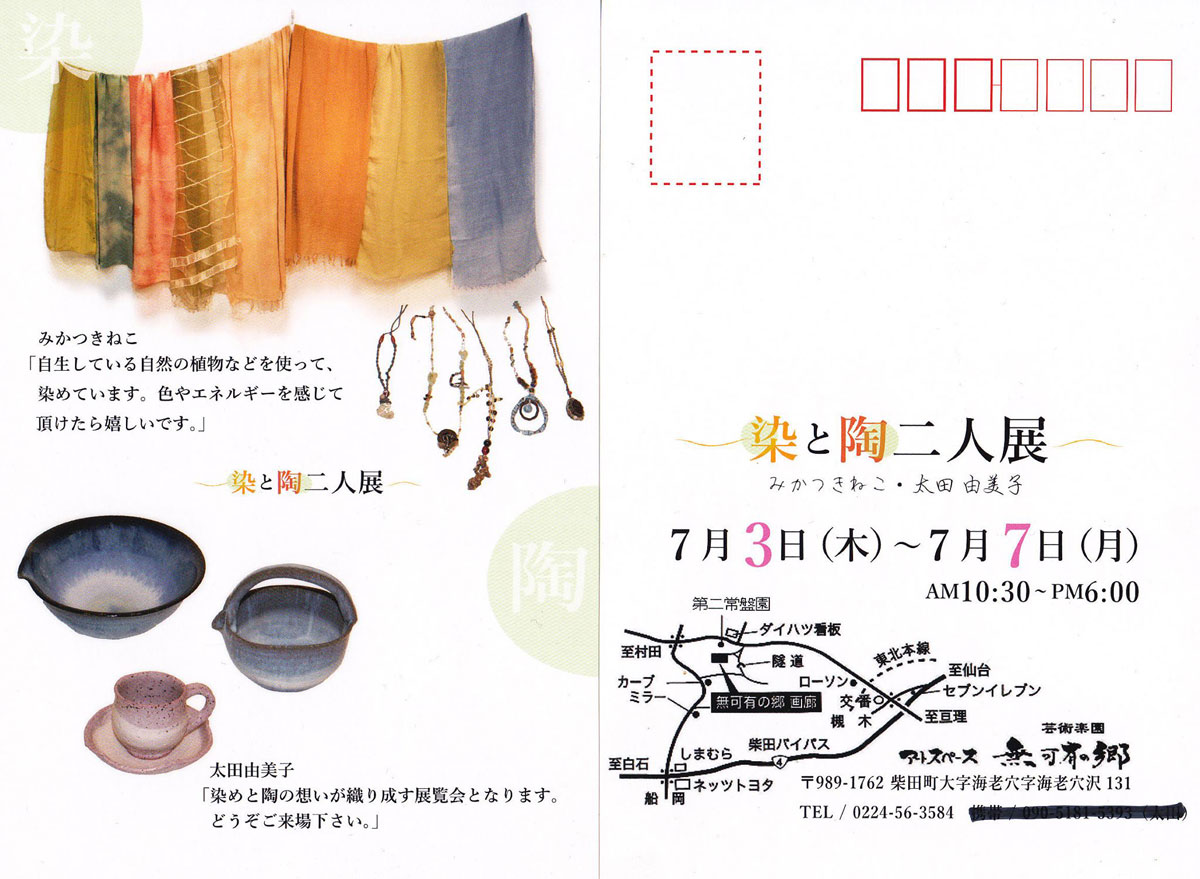 友だちの二人展を見に隣町の「無可有の郷」へ。1年前に一緒に作品展をやったあやこさんの染とアクセサリー。