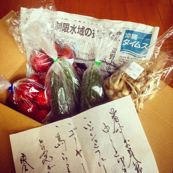 沖縄のカミさんの友だちから島ラッキョウ、バッションフルーツ、ゴーヤーの暑中見舞いか沖縄タイムスに包まれて届いた。もうすぐ会える。