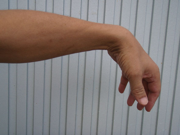 橈骨神経は指を伸ばしたり手首を手の甲側に起こす筋肉を担当しているので、この神経がマヒしてしまうと手首が垂れ下がったままになってしまうのです。