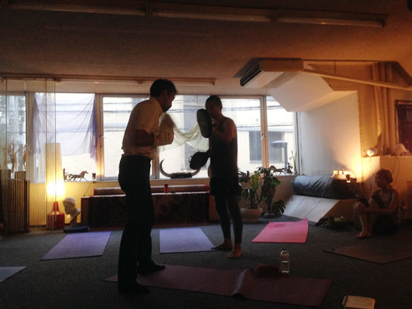 そして、僕にとって初めてのヨガは元プロボクサーの小林秀徳さんが講師のヨガボクシングでした。途中、パンチのやり方も習って体の軸を意識してジャブとストレートを打った。小林さんがミットを構えて実際にミット打ちもやった。一度きちんと習ってパンチをしてみたかったので、これもすごく楽しかった。小林さんが構えるミットにきれいに拳が入ると乾いた高い良い音がして気持ちがいい。パンチを打つ時は息を吐きながら。先生が他の方のところにミットを持って移動して行った後も夢中になってシャドウボクシングを続けた。楽しい。