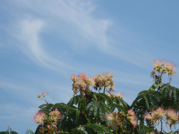 道路脇のあちこちの山で今、ねむの木の花が盛りを迎えている。