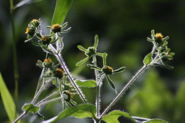 午前の仕事上がりに、木漏れ日の当たる黄色い花の蜜を美味しそうに吸っているアブの写真を撮る。
