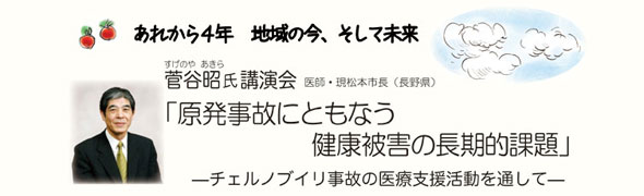 菅谷昭氏講演会 約一ヶ月後の講演会の宣伝です。直前になったらもう一度エントリーするかもしれませんが。 菅谷昭氏講演会 -原発事故にともなう健康被害の長期的課題- 原発事故の後、国は直ちに健康に被害は無いと言い、ほとんどの首長は市民の健康 […] もっと読む » 2015年2月9日 | コメントはまだありません | カテゴリー: 大震災と原発