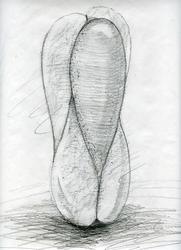 仙台でのグループ展に女性の友達とふたりで来てくれた方が、大震災の後に命をテーマにした作品「HA RA MU」(最初は漢字で”孕”だったのを改題)を両手で包むように撫でながら、こんな感じの小さくて手で撫でられるような彫刻が作れるかと会場で相談していただいた。ずっと前にデッサンは描いて、いつか実際に形にするだろうなと思ってはいたけどそのままになっていた。大震災の後、へそ曲がりの僕がそれまでは考えられなかったシンプルに命を賛美するような形を作り始めた頃に、そのデッサンを思い出して頭から離れず実際に黒御影石で小さな彫刻にしたばかりの作品だった。