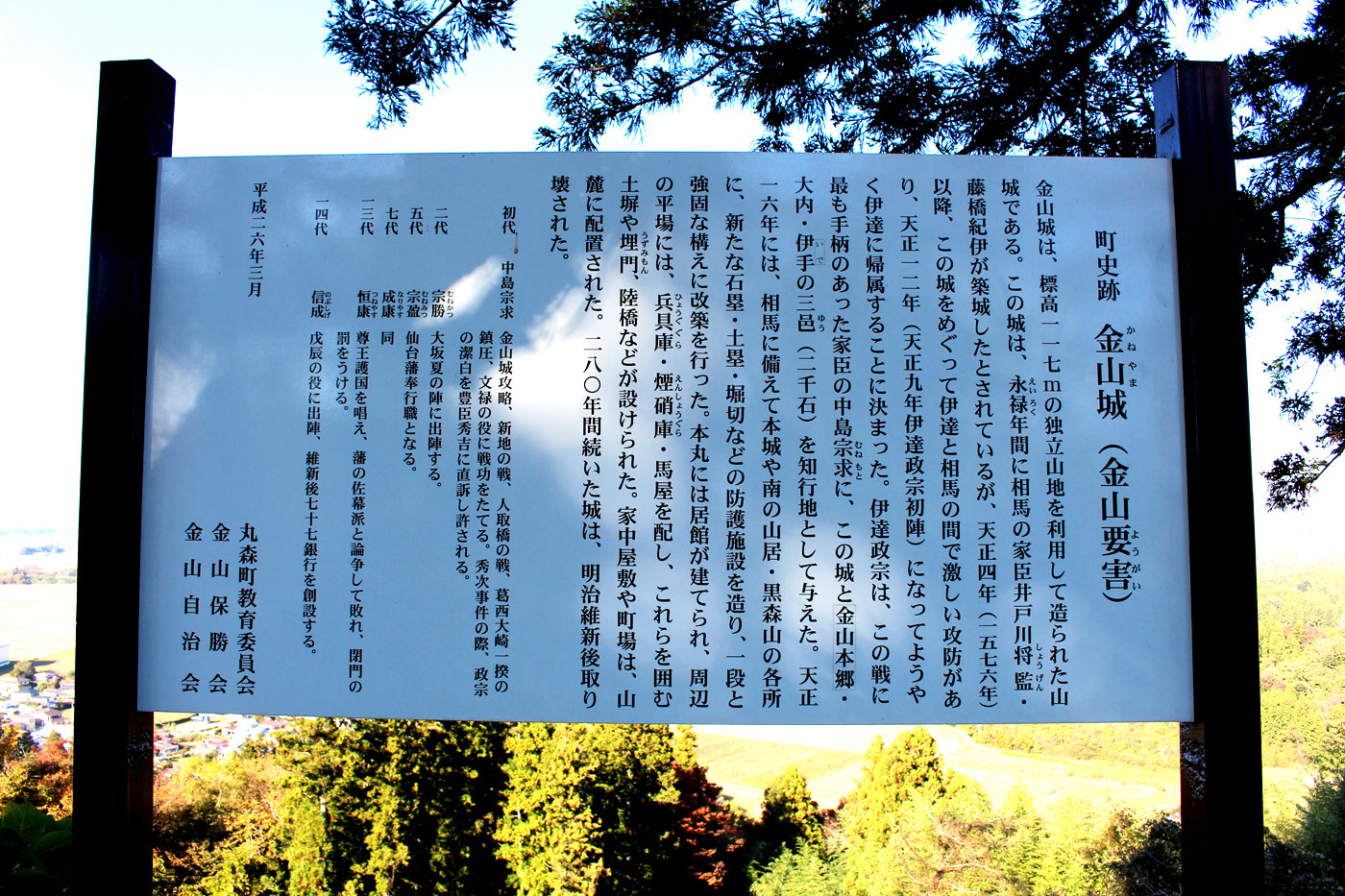 金山城は相馬の家臣 井戸川将監・藤橋紀伊守によって築城したとされている。そして伊達と相馬の間で争奪戦となったこの城が天正12年に伊達に帰属することに決まった際に、伊達政宗が最も手柄のあった家臣の中島宗求にこの金山城をあたえたそうだ。そしてそれから十四代目の中島信成の略歴を見てびっくり。この写真クリックで大きくできるようにしておきました。
