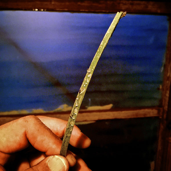 石を磨いていた足元の草が揺れても水玉が微動だにしないのに気がついた。そうか、そのまま凍ったのか。縦にしても落ちない Frozen Drops 。写真ではうまく撮れなかったけどキレイだった。寒い屋外で仕事するのが心底嫌だったらきっと何か対処してるはず。泣き言を言いながら外で働いているのは、こんなものを見つけたり、極寒の時に外にいるからこそ見たり体験できる喜びもあるからだ、きっと。氷の写真撮ってても夢中になって寒さ忘れる。雪と空の写真も家の中では撮れない。目の前で水が凍っていくところ見られるなんて外で仕事しているからだ。ちょっと馬鹿だけど。