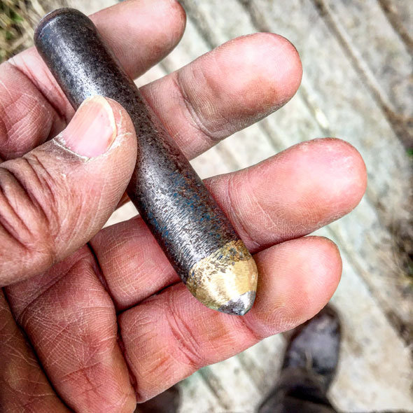 普通の、はつりノミは未熟だった頃は安くないノミを、1日で何本も折ったりした。いくつも買い足して仕事してきたけど、この字彫りノミは石彫りを始めた頃から、これをずっと使ってきた。もう、使えないけど、捨てられない。お守りにしよう。
