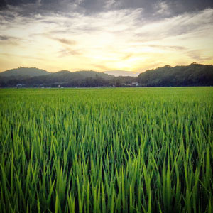 夕方。稲の葉の先に吸い上げた水。無数のダイヤモンドを散りばめた様な夕方の田んぼ。これを見るのが大好き。