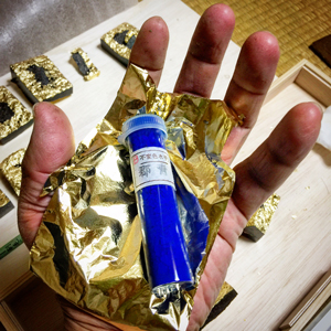 石と金箔(真鍮箔)に群青を組み合わせようかと思案中。久しぶりに膠溶かすか。