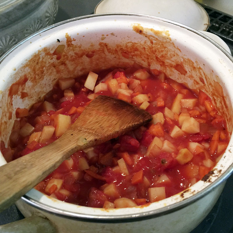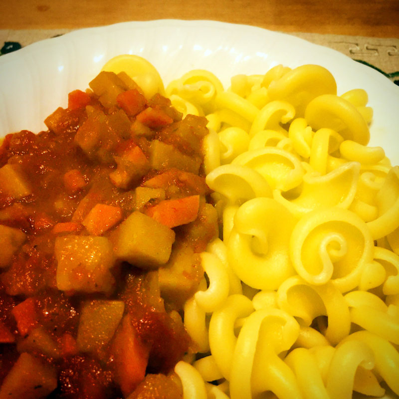 煮込んだスープをトマトソース代わりにしてデュラムセモリナのパスタ La Fabbrica della pasta di Granano – Vesuvio にかけて夕食。いただいた、このパスタがとても美味しい。