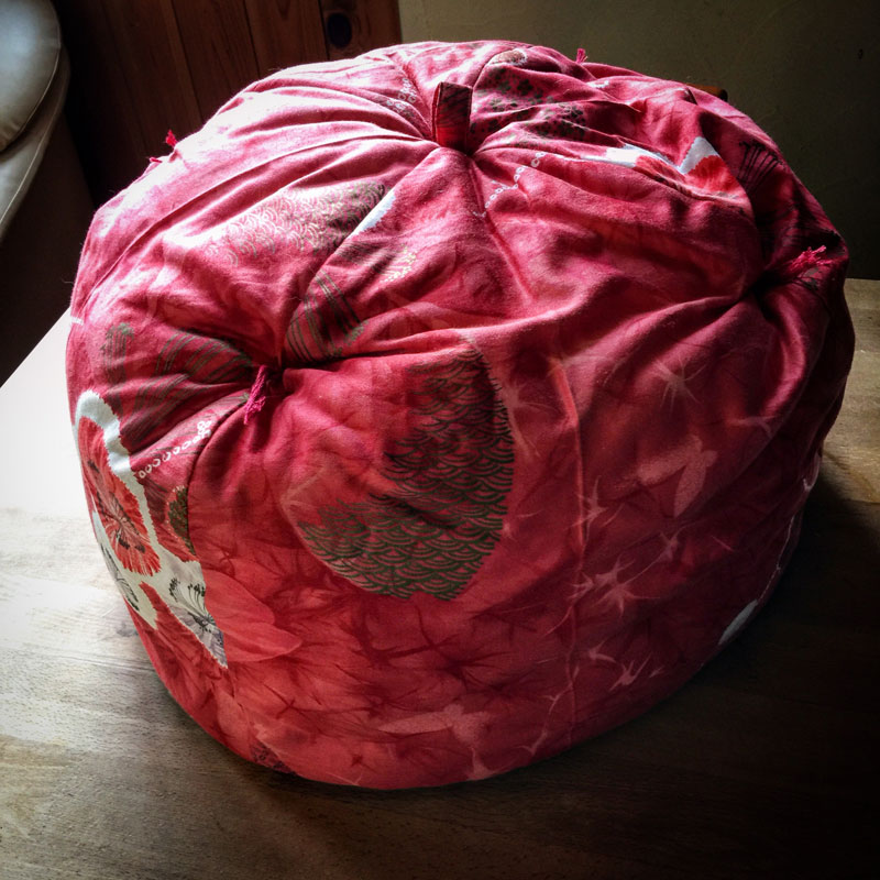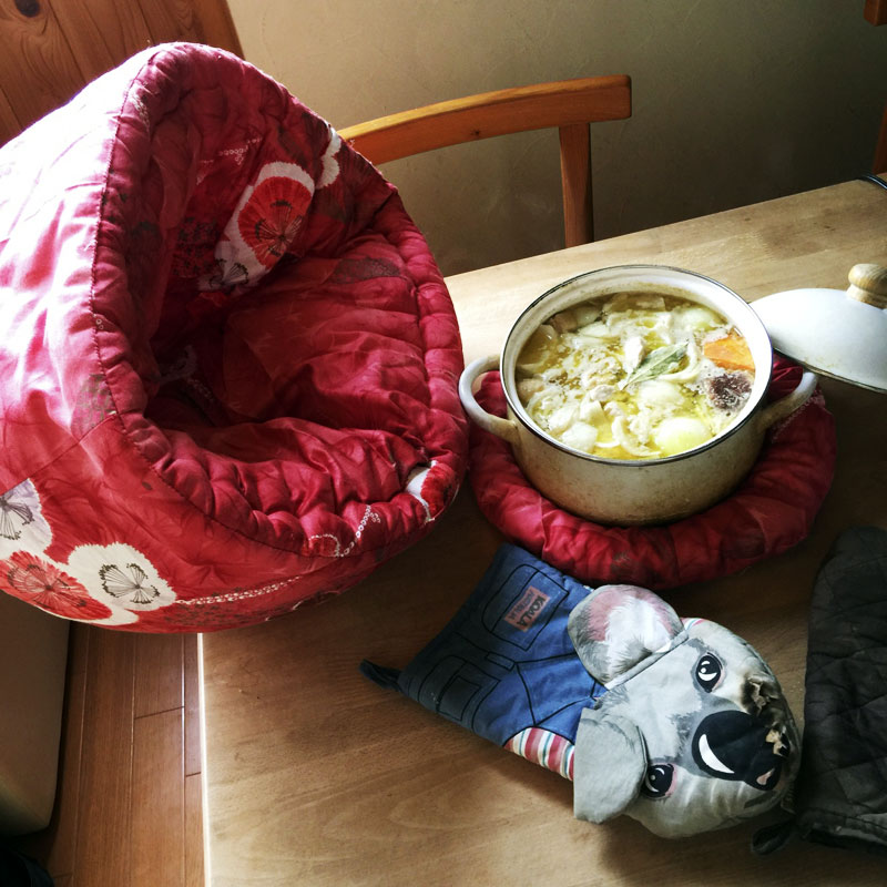 三重県の叔母さんにもらった鍋帽子。鍋を入れるとその保温力でゆっくりと鍋の中のものに火を通してくれる、というもの。