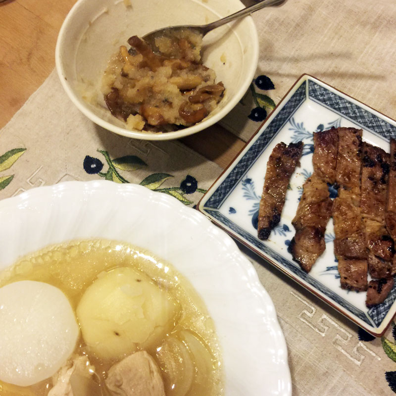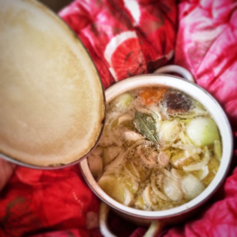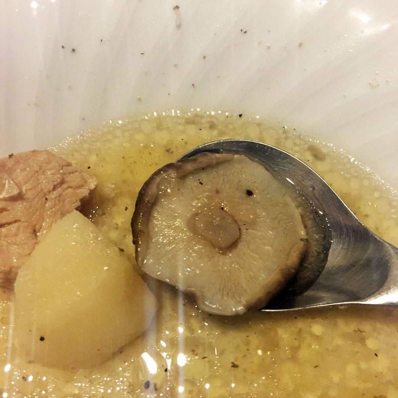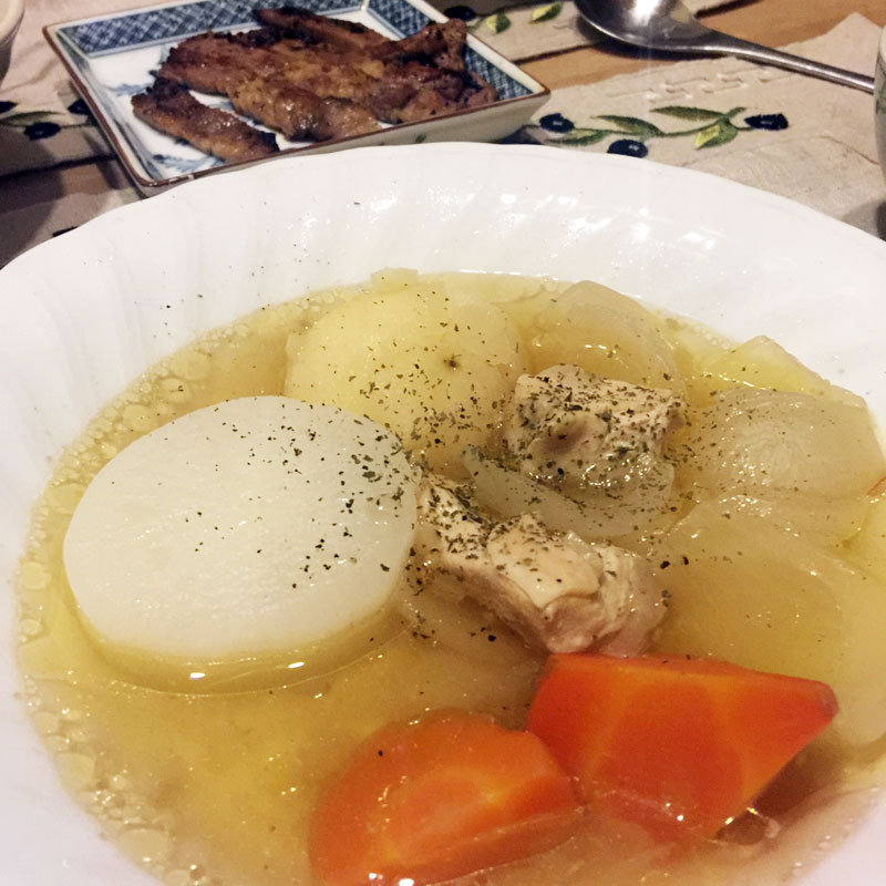 昼に作ったポトフ。スープを濁らせたくなかったので沸騰直前に日を止めて鍋帽子を被せておいて、夕方、鍋帽子をとってフタを開けたら湯気が出ました。半分に切ったジャガイモも崩れそうにやわらかい。