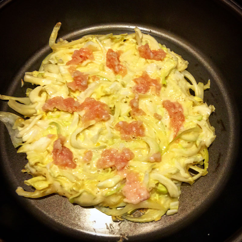 普通のお好み焼きは豚バラのスライス。でもわが家はひき肉。そのお陰で旨みが全体に回るし何より切りやすい。ホットプレートで作って、プラスチックのヘラで切り分ける家庭でのお好み焼きには「府中焼き」こそがピッタリ!豚バラヘラで切れない!