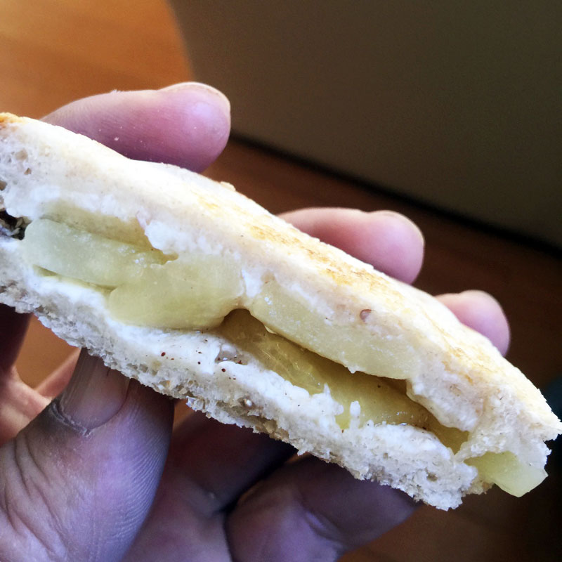 昼食。カミさんがリンゴとクリームチーズのホットサンド作ってくれた。