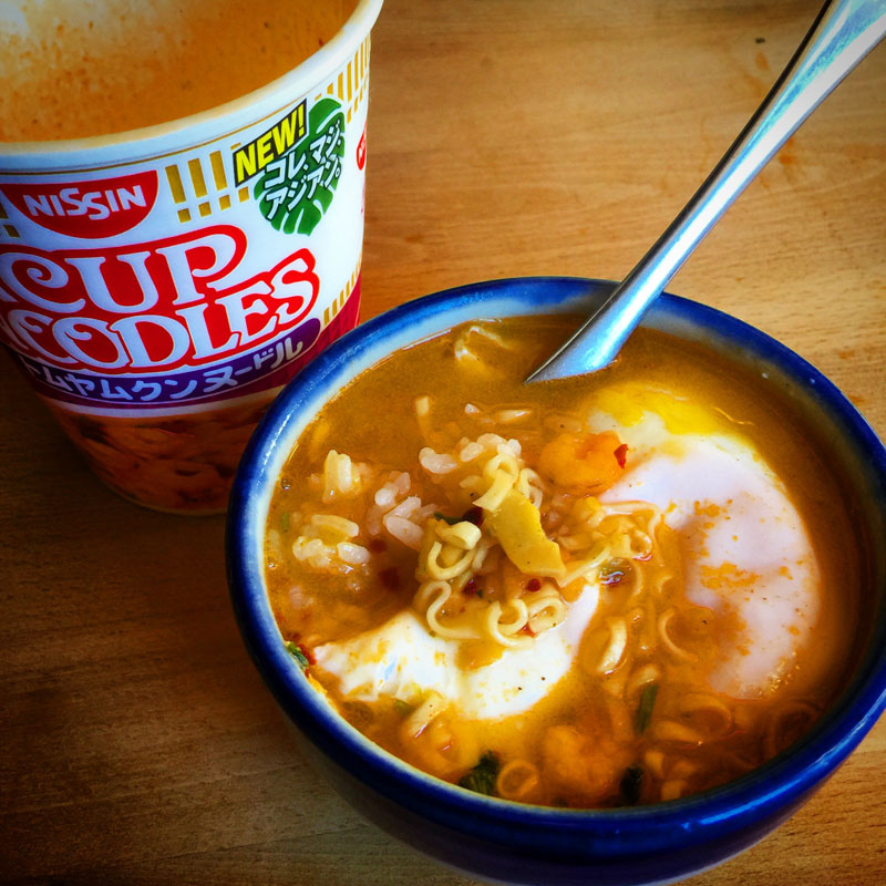 mariさんがくれたトムヤムクンヌードルの麺を食べた後、目玉焼きを乗せたご飯にスープをかけてトムヤムクンライス。旨い、熱い、ありがとう!