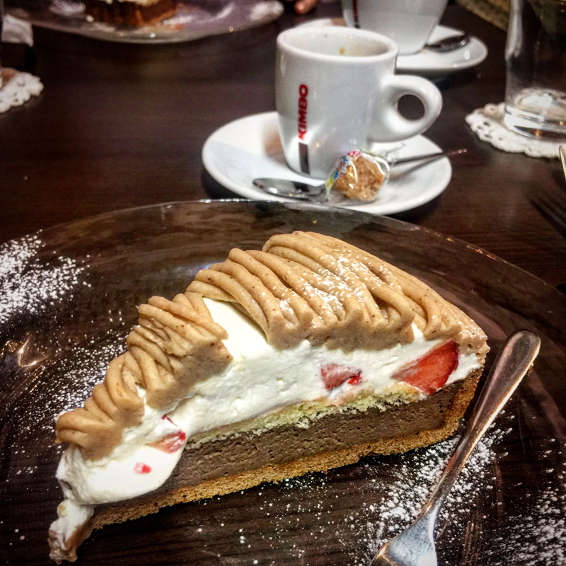 新作のおすすめのケーキはチョコレートのタルトの上にフルーツとマロンクリーム。由美さん天才。