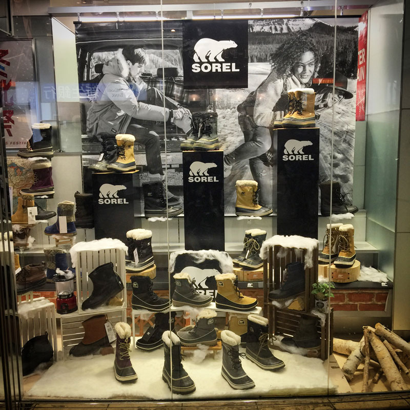 ウィンドーショッピングしながら少し歩く。僕のスノーブーツはSOREL。お気に入り。