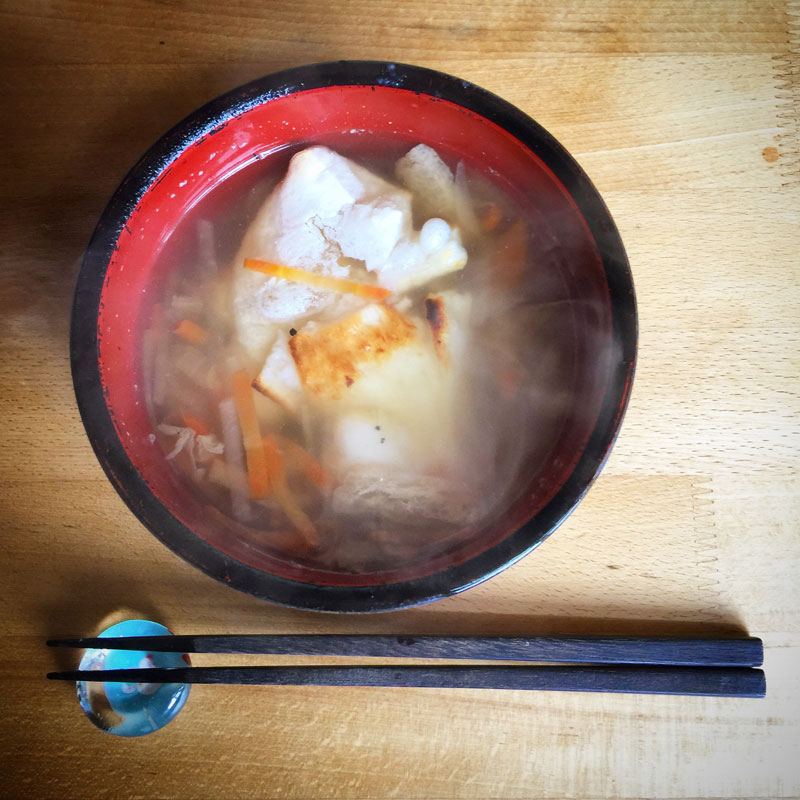 杵と臼でついたお餅の雑煮。同じモノを食べ続けるという病にかかっています。