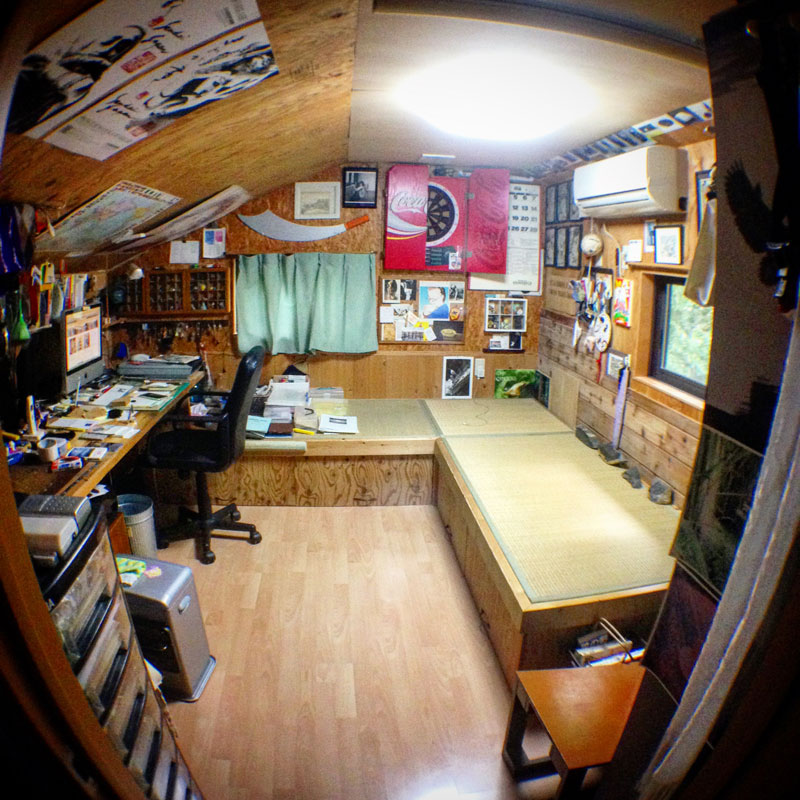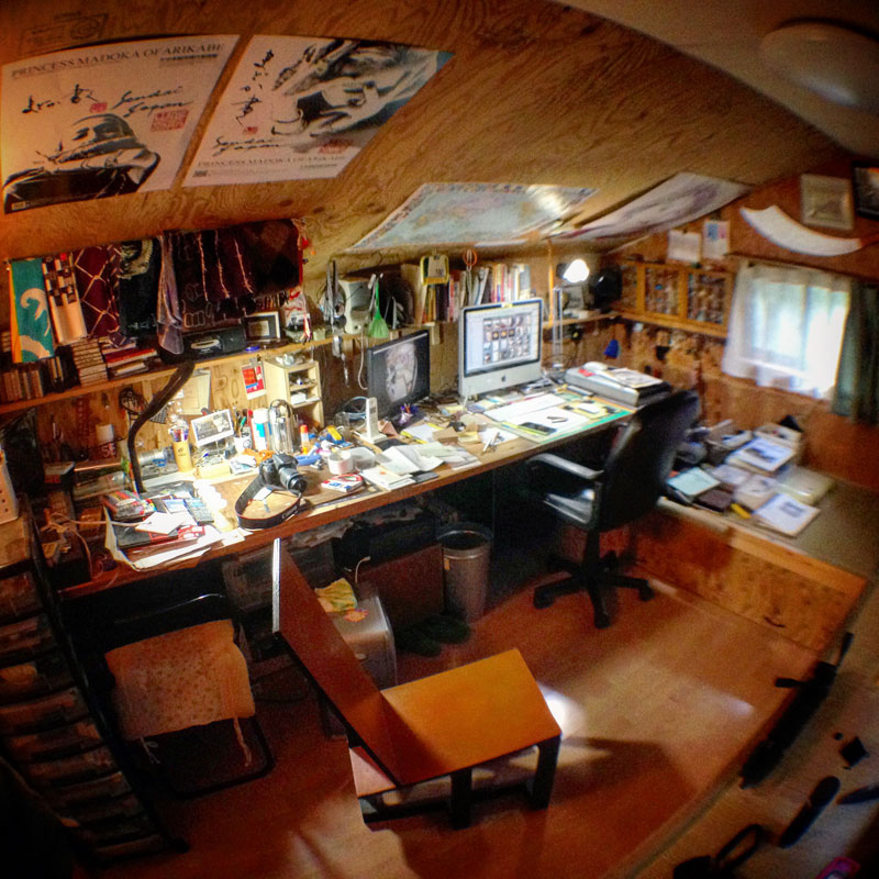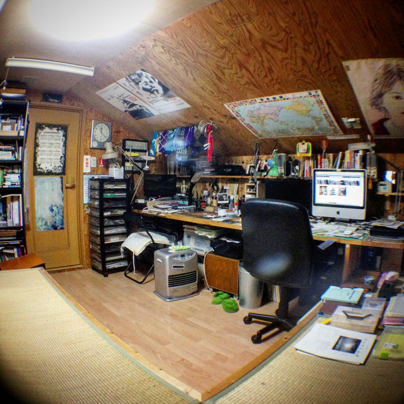 魚眼レンズ面白い!小さな部屋だから今までどうやってもこの部屋の感じを写せなかった。この写真は僕のイメージの中の仕事部屋だ!