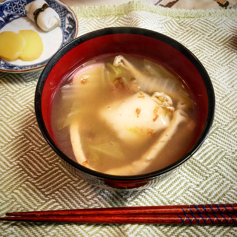 今朝の雑煮は新城の祖父母のところでよく食べた、白菜と餅をドロドロに煮込む雑煮。見た目は悪いけど美味しい。