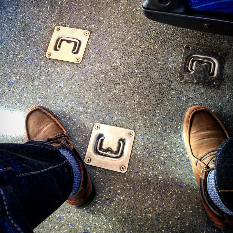 街まで出かけようって事になって、カミさんと妹と姪っ子ふたりでバスに乗る。車椅子を固定するためのフックかな?