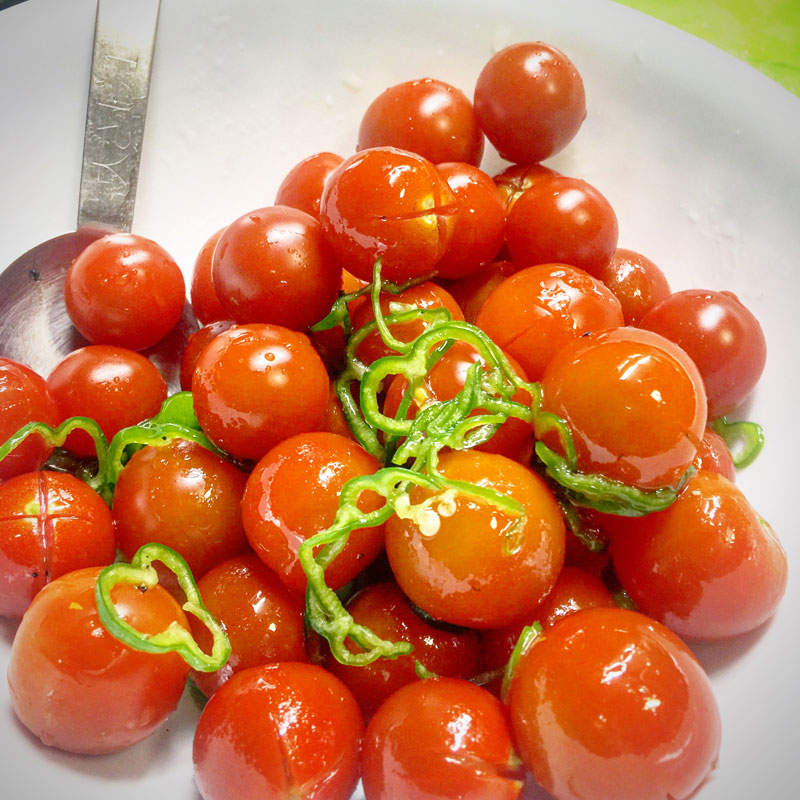 姪っ子が夕食のミニトマトサラダ作り始めた。今作っておくと、味が馴染んで夕食の頃、ちょうど良くなるんだって。ちゃんと味がしみるように十字に隠し包丁入れてある!芸が細かい!