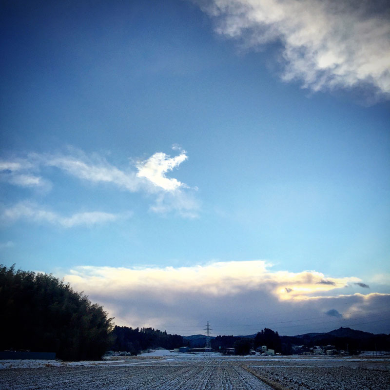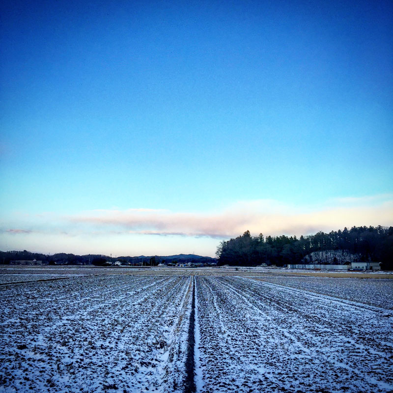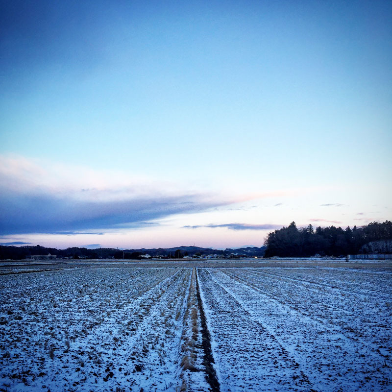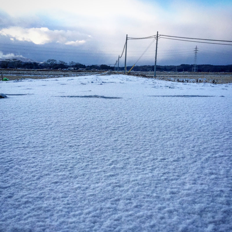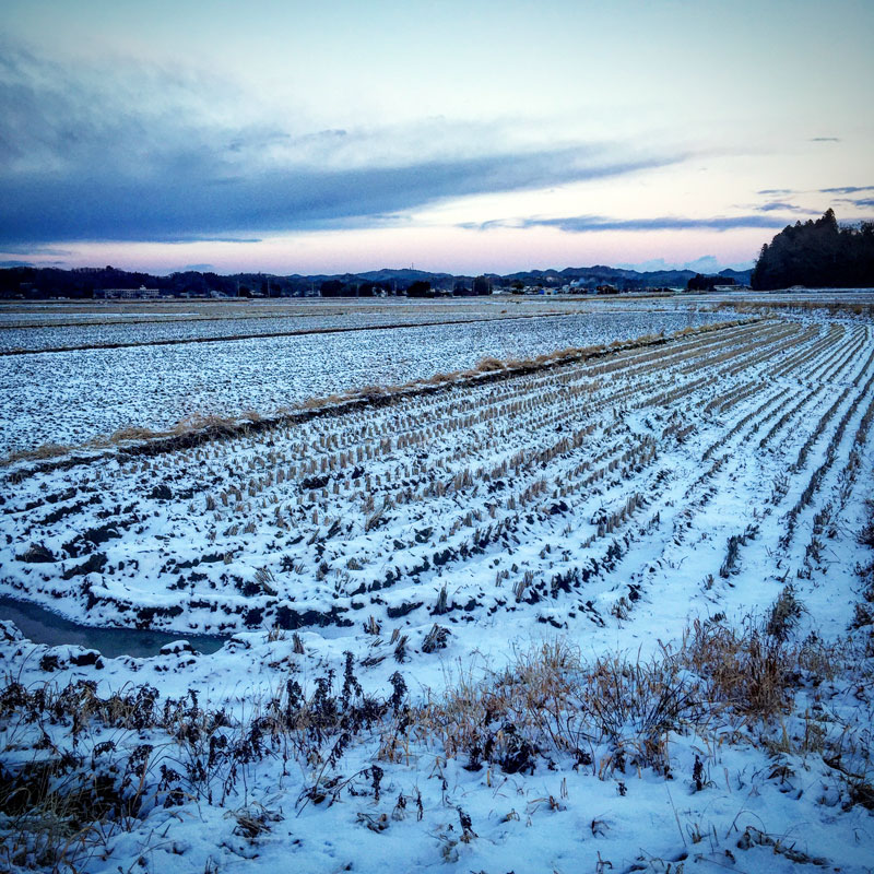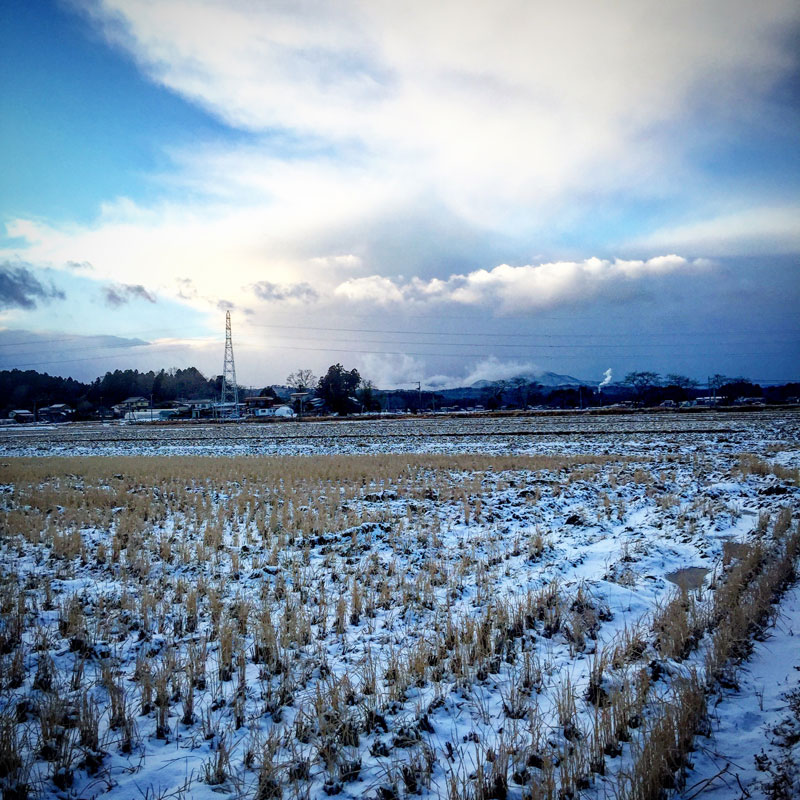 雪の田んぼに刈り取り残されて立ち枯れた稲が、温かさを感じさせる。それにしても滅茶苦茶寒い。スマホ操作してる手が寒い、というより痛い。