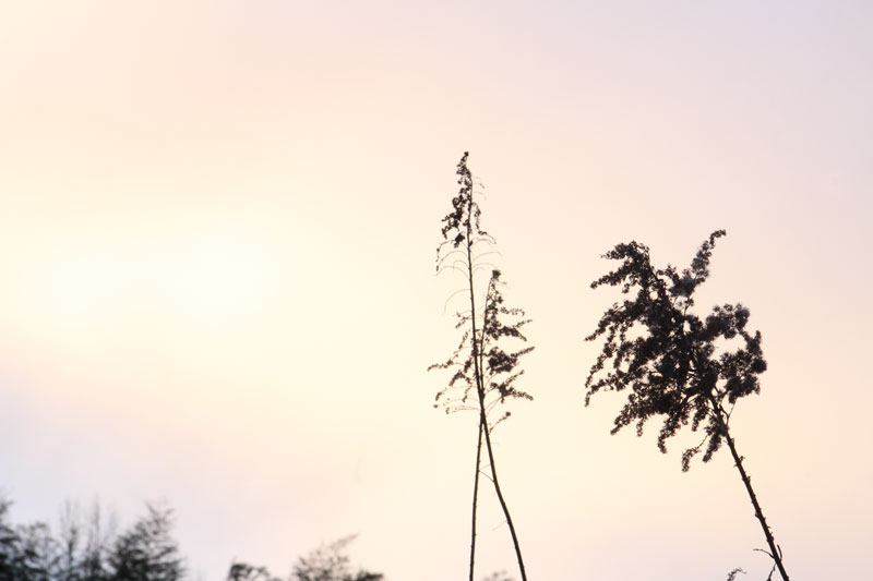 日没の頃、空がほんの少し焼けた。田んぼに刈り取り残された稲の模様がリズミカル。