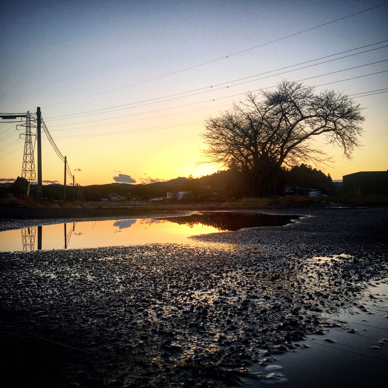 でかい水たまりに落ちる太陽。