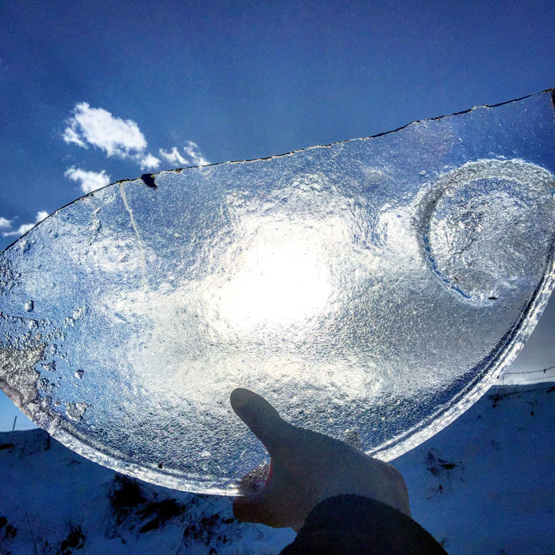 ドラム缶の大きな丸い氷を取り出して写真を撮ろうと思ったんだけど。大きすぎて半分に割れてしまいました。氷の中の太陽。