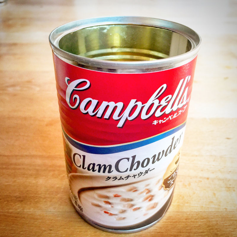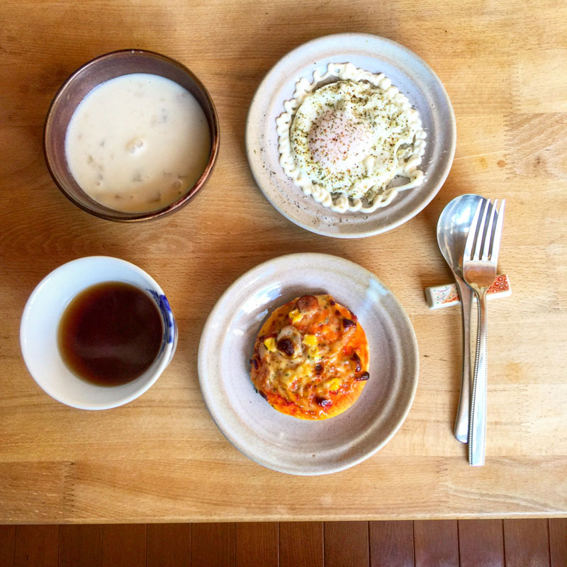 ランチ。ピザ、目玉焼き、Campbell’sのクラムチャウダー。スープの器は自作の柿天目。
