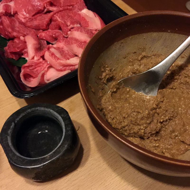白胡麻を煎ってねっとり油が出るまですり鉢ですってほんの少しの砂糖に醤油と出汁で伸ばしたらごまだれの出来上がり。