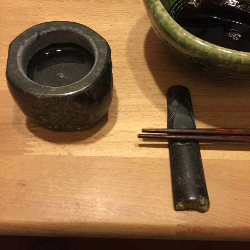 クレジットカードの溜まったポイント交換でゲットしたちょっと良いお肉なので気合いが入ります。出来たばかりの伊達冠石の(自分用にした)ぐい呑みと、昔々作った伊達冠石の箸置きでいただきます。