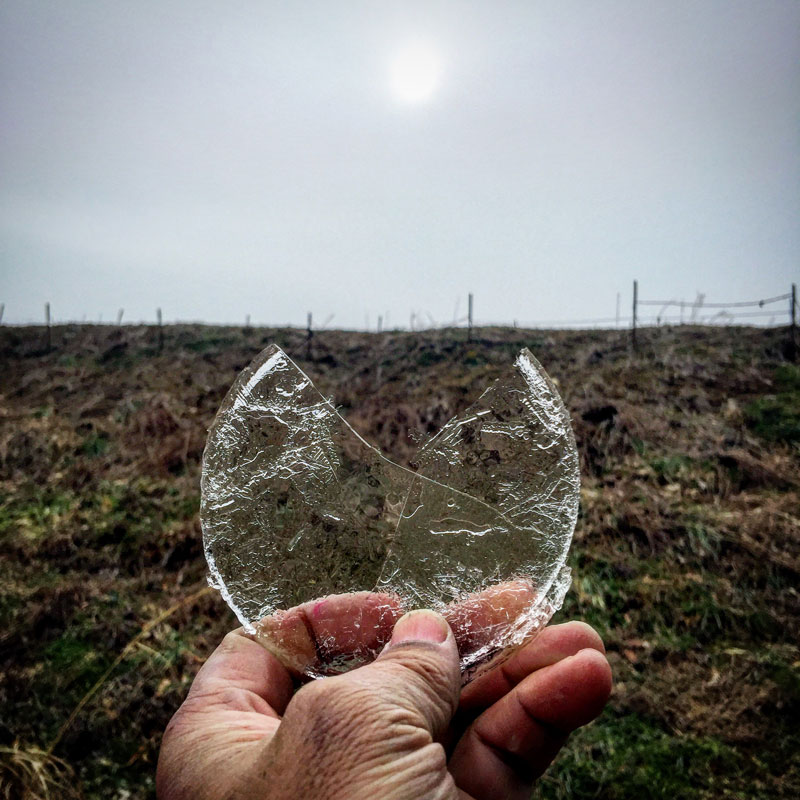 この氷の写真を撮るために、昨日、仕事場の大きさの違う入れ物に水を入れて帰った。今朝、凍ってた。薄氷だけど。大きさの違う丸い氷、重ねてみた。