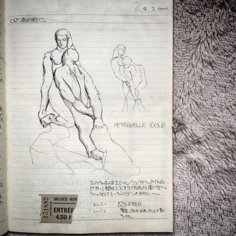 2ヶ月の旅の間、大学ノートにボールペンで日記をつけた。日記だけじゃなくて貼り付けられるモノは、糊で何でも貼り付けた。美術館や交通のチケット、その土地のトイレットペーパー、お菓子の包み紙etc,etc。日本と違ってヨーロッパは美術館内で本物をデッサンできるから、それも良く描いた。これはロダン美術館にてロダンの作品を見ながら描いたスケッチ。