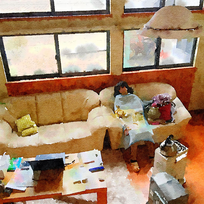 午後の仕事に戻ります。連日仕事で忙しいカミさんは、みの虫のように毛布にくるまってほんのつかの間の休憩。そっと出て行く。