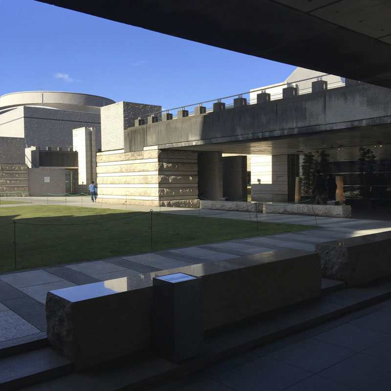 桜色の御影石のベンチをかねた結界。磨きと割れ肌を美味く使っている。