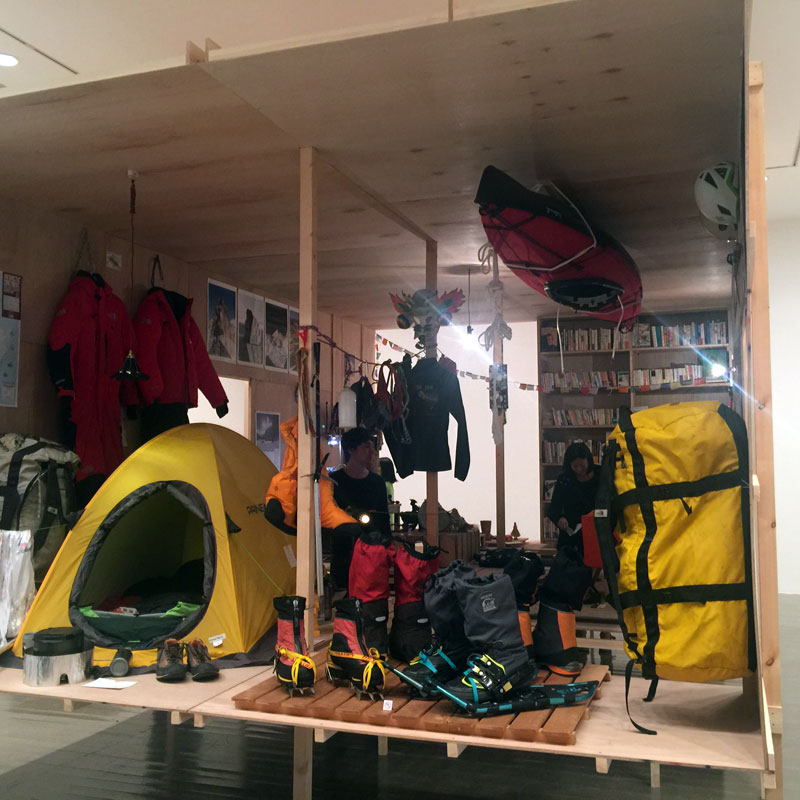フィールドワークで実際に使っている道具の展示も。キャンプをやっている者にとっては別の意味でも興奮する。奥の本棚には石川氏の読んでいる本が並んでいる。最近、こんな展示が少なくない。より「世界」を知ることが出来る工夫で楽しめる。おととしの夏に見た、石川直樹+奈良美智 展「ここより北へ」 でも旅の靴とか読んでいたほんとか身の回りのモノが展示されていた。